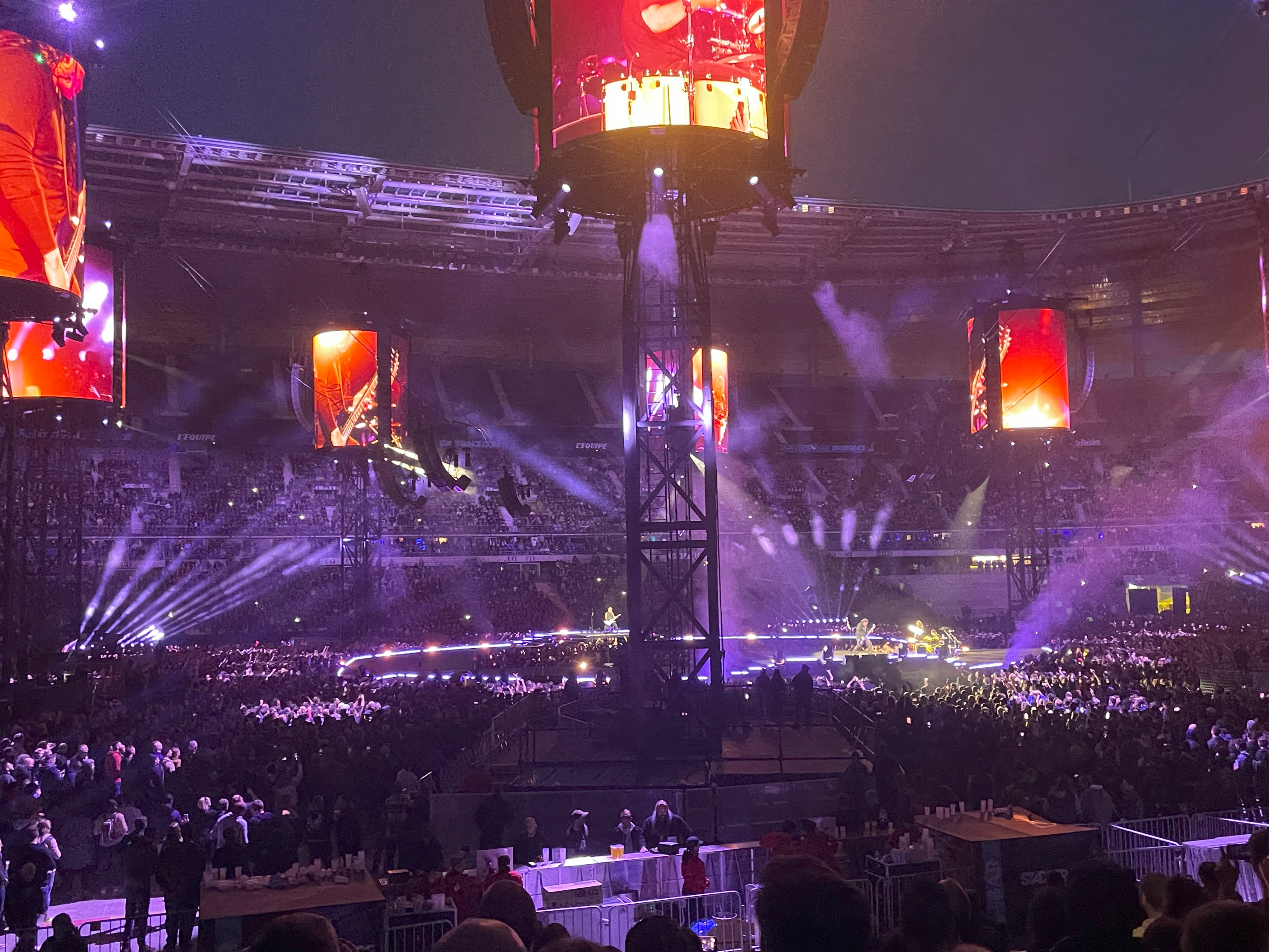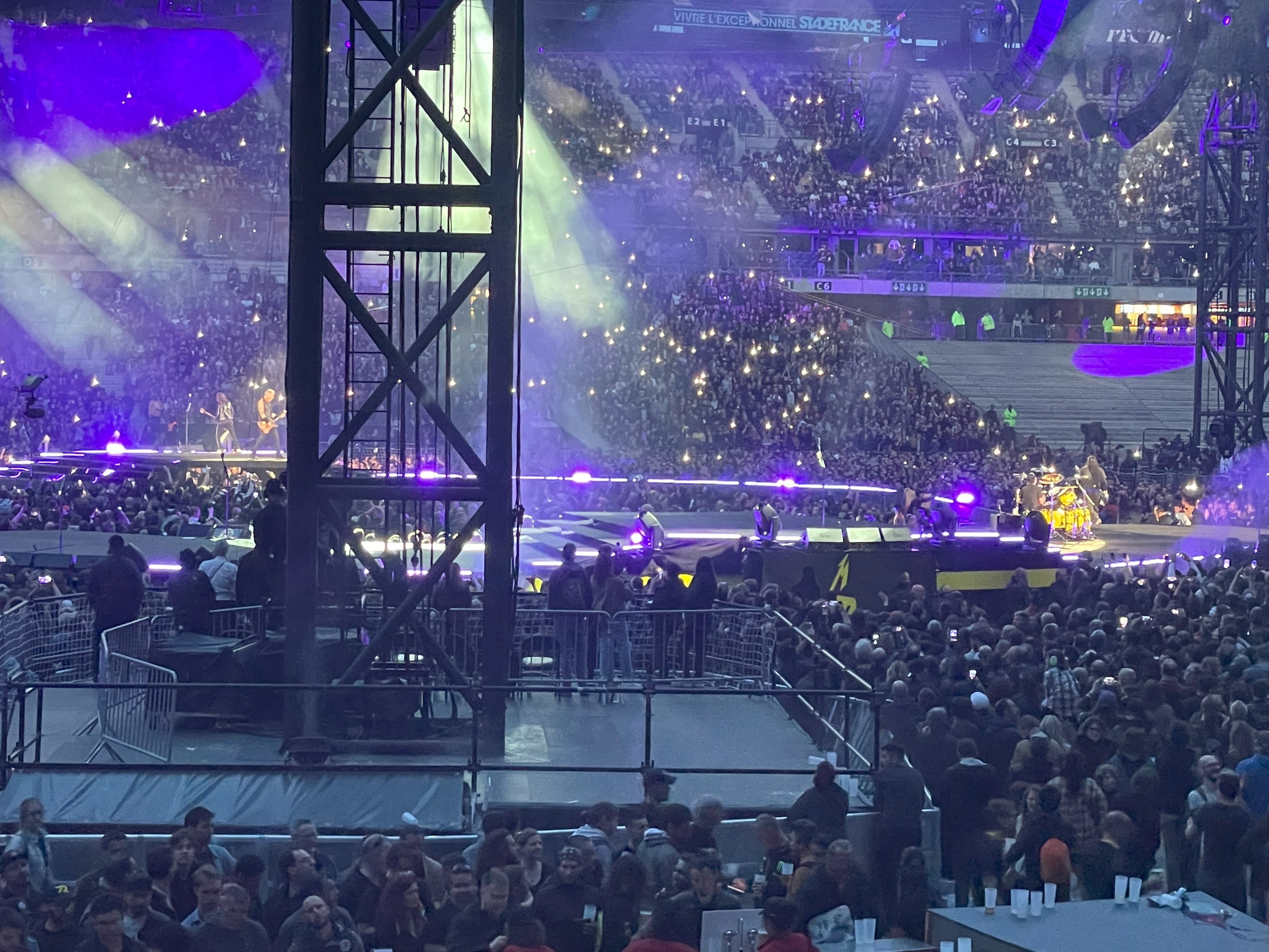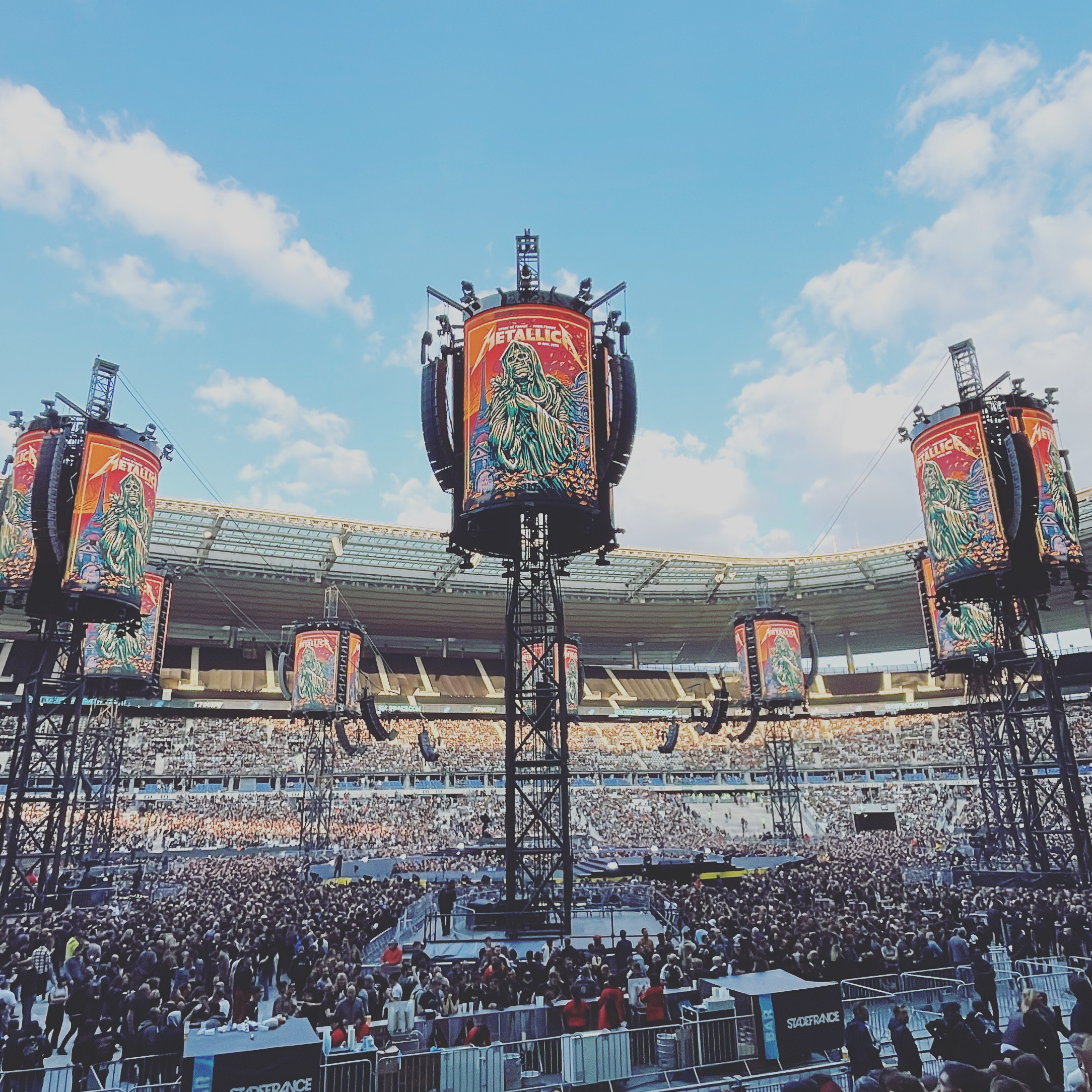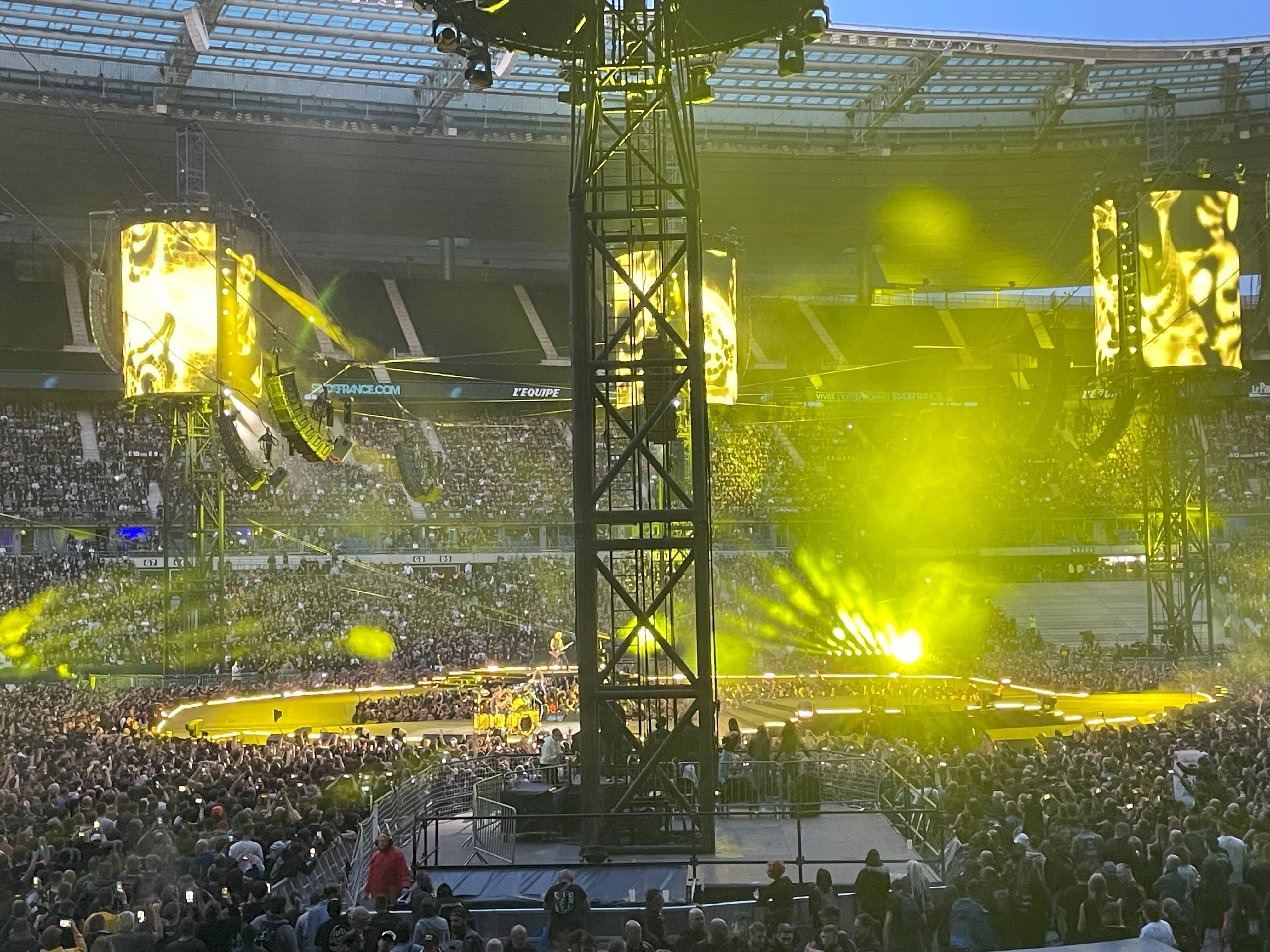 We sat down 20 minutes before the show. The anticipation was building despite the continued sunshine. At this time of year, sunset in Paris is well after the normal start time for Metallica at around 8:45 PM. With all the exhaustion from the travel to Paris, and the transit debacle getting to the stadium, I barely had time for it to sink in that I was about to live a life-long dream to see Metallica in Paris! It hit me like a ton of bricks when the loudspeaker blared AC/DC’s “Long Way to The Top”, the traditional cue that a Metallica concert is about to start. We were minutes away and I thought my head was going to explode!