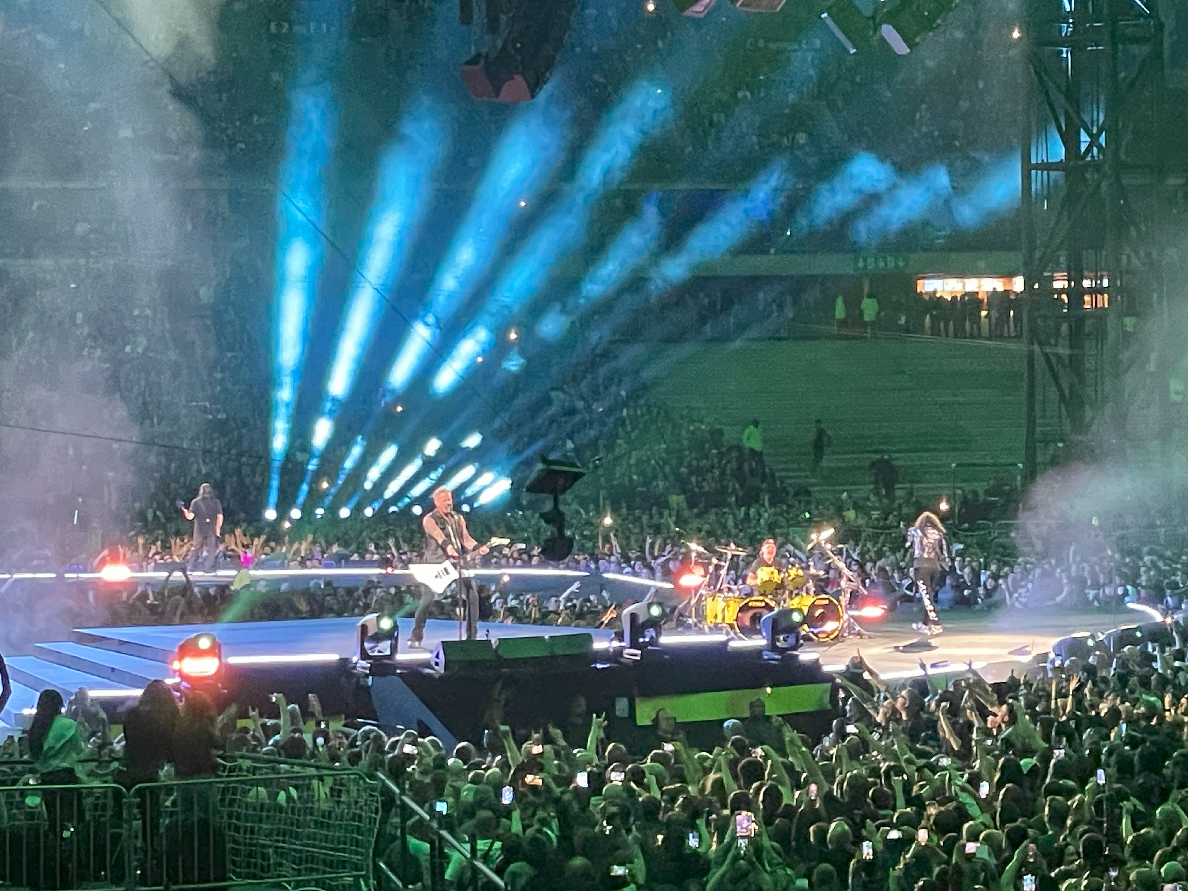 Our seats were in the lower bowl in the 16th row. I normally like getting general admission tickets for Metallica so I can get close, but I had a Ticketmaster snafu and accidentally bought seated tickets. This tour is the first time that Metallica featured a stage in the round in a stadium, normally that practice is reserved for arenas. There were six lighting and sound towers that surround the stage and one of them partially obstructed our view, but not to the point that we would miss any substantial part of the show.