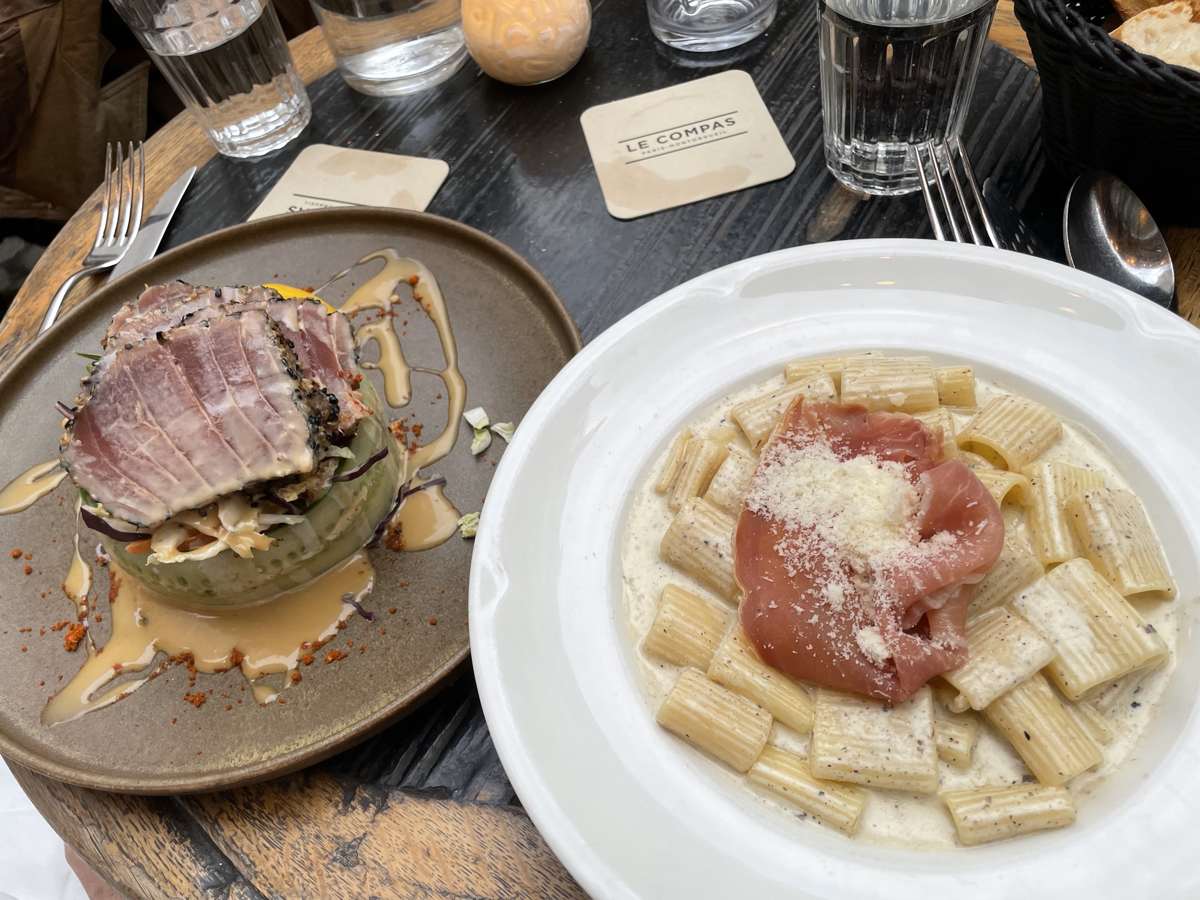 After avoiding catastrophic injuries due to the “riots” we ditched that part of town and went to Rue Montorgueil for the night. Rue Montorgueil is another Parisian walking street with lots of open restaurants and bars with outdoor seating. We settled on Le Compas on for dinner. I went with the pasta and Susan ordered tuna and it was another fantastic meal.