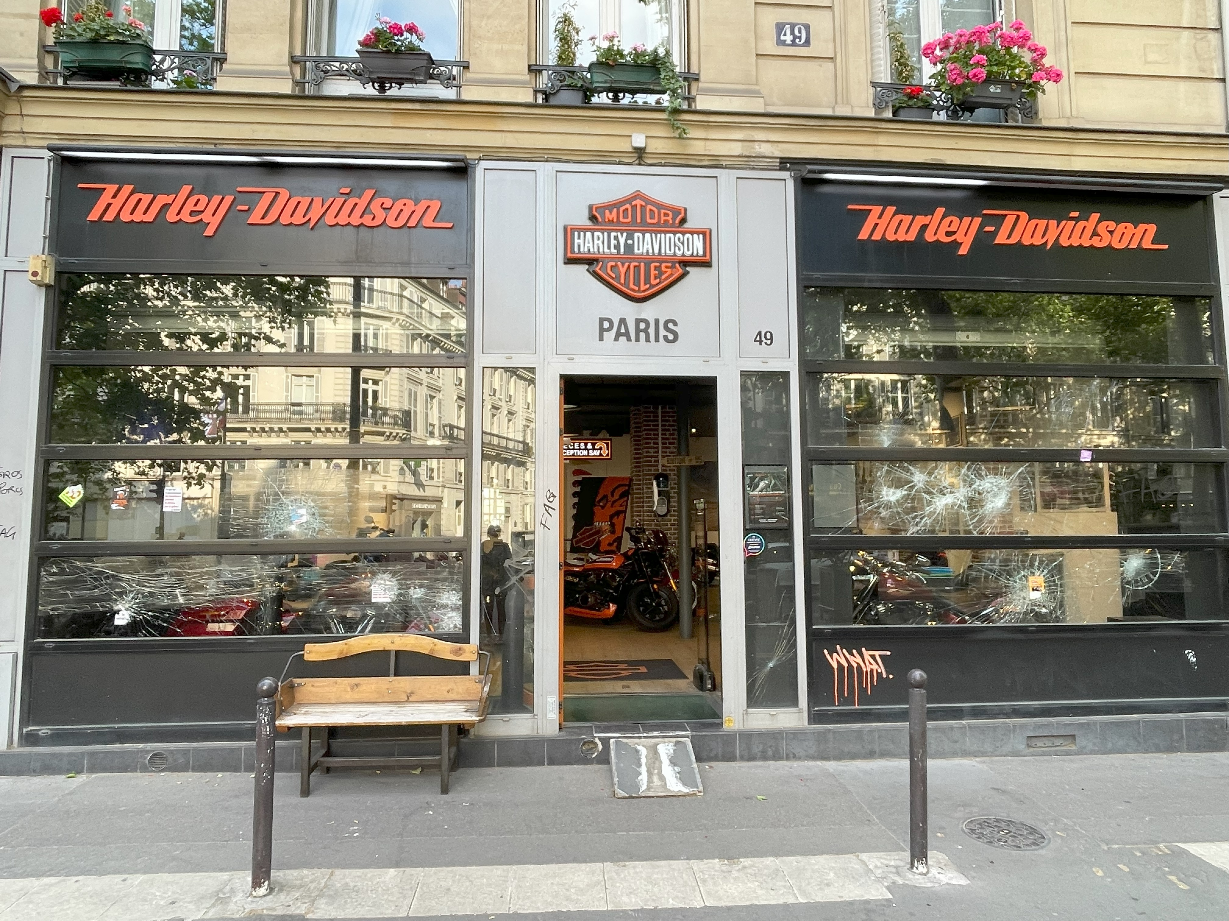 I noticed that the dealership windows were smashed with a blunt object. I asked about it and was told that the protestors had targeted them for some reason.