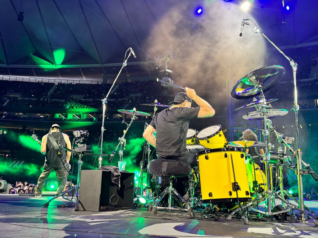 This turned out to be a fortuitous decision. We were standing right by the inside of the wall where the third drum kit popped out. The band ripped into the instrumental “Orion”, and we were right there to watch all four of them jam! We were so close that Lars’ drums overpowered the sound from the main PA system.