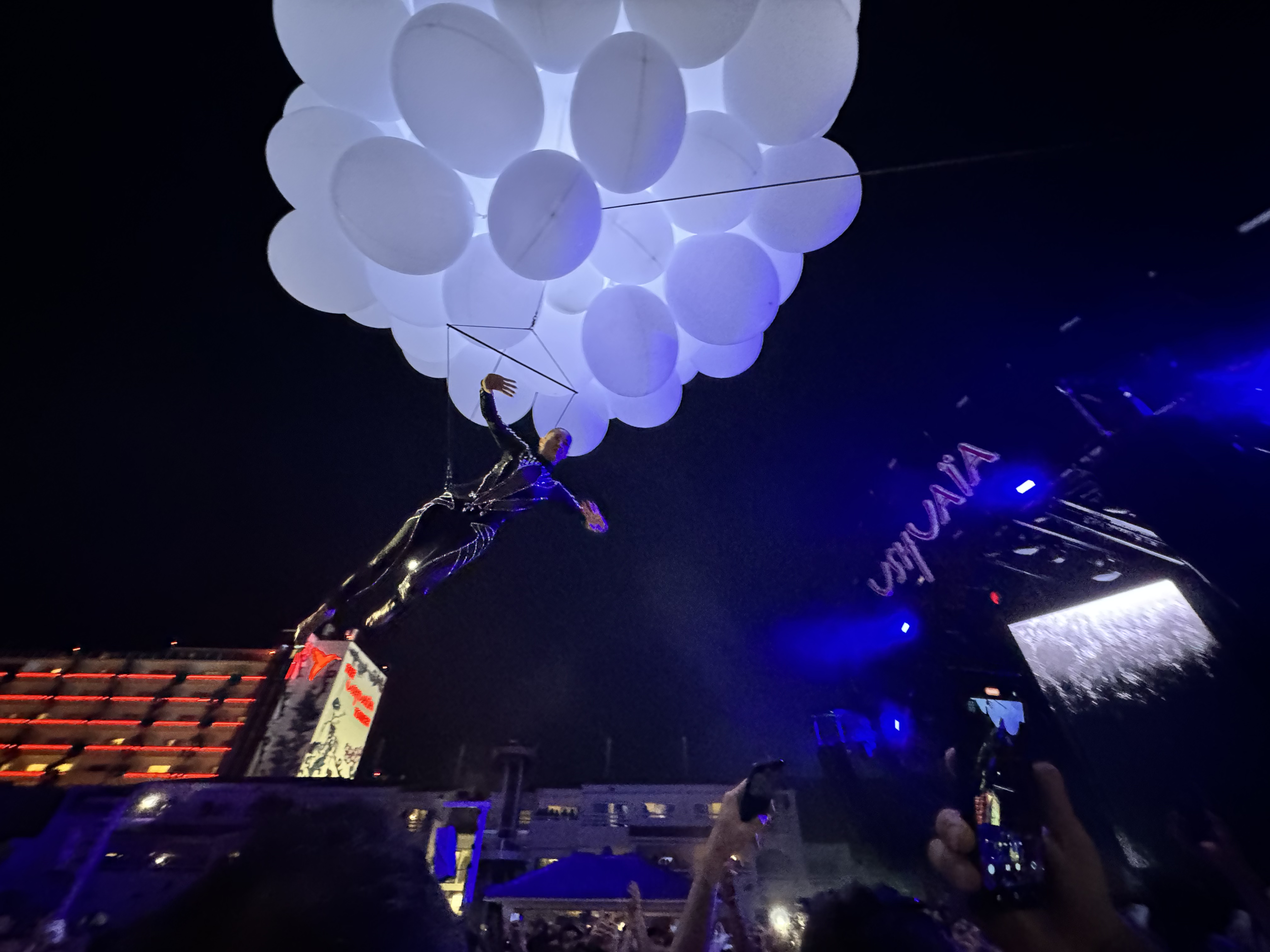 I’ll hand it to these DJ’s. They put on an elaborate show. Dance music is not my cup of tea, but they incorporated plenty of pyrotechnics, on-stage dancers, and even an aerialist suspended by helium balloons into the show.