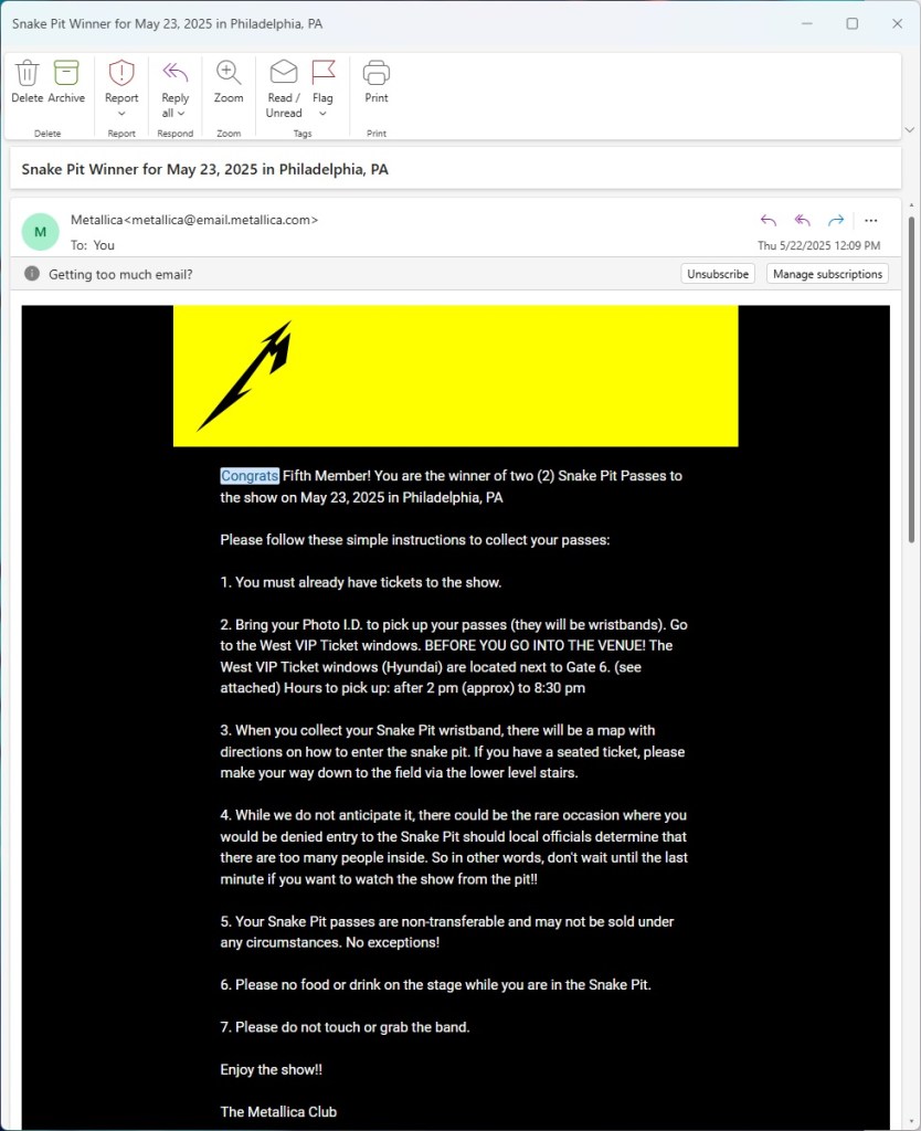 I was working from home the day before I was to attend the first of two Metallica M72 World Tour concerts in Philadelphia. I was trying to focus on getting through the workday so I could get ready to split in the morning. I got the alert that I won two Snake Pit passes through the Metclub contest and my mind went blank.